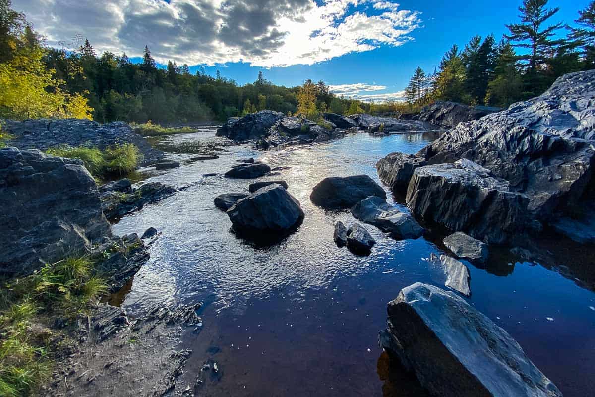 Banning State Park in Sandstone Minnesota provides partial hookup RV and tent camping in a treed setting. Hiking trails and lookouts to watch daring canoeists and kayakers shoot the turbulent rapids at Blueberry Slide, Mother's Delight, Dragon's Tooth and Hell's Gate.