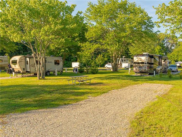 Devil's Hopyard State Park in East Haddam Connecticut offers primitive tent and RV camping in a park where the principle feature, Chapman Falls, drops more than sixty feet over a series of steps in a Scotland Schist stone formation. The water from the splash pool at the base of the falls, continuing as the Eight Mile River, flows through the park's hemlock-canopied picnic area, providing a tranquil setting for a family outing.