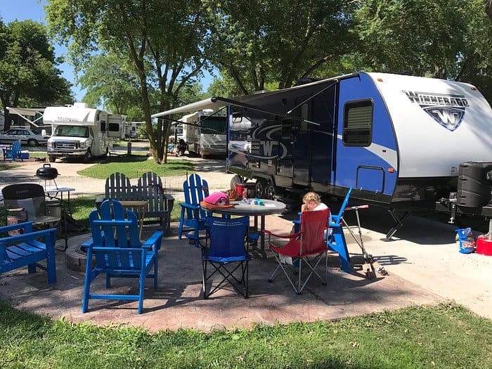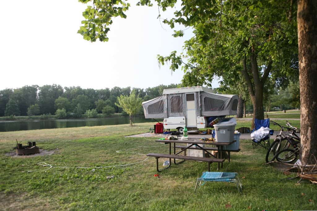 Lake Manawa State Park in Council Bluffs Iowa provides partial hookup RV and tent camping along the south shore of a recreational lake. Trails follow along the shoreline for biking and hiking.