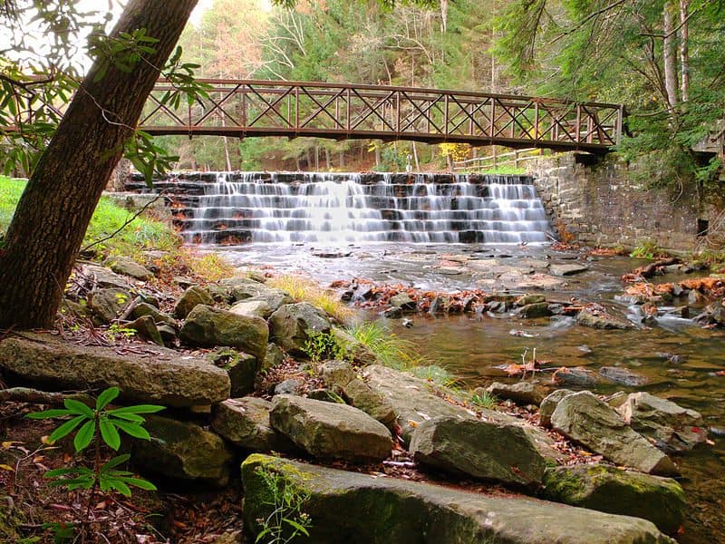 Parker Dam State Park in Penfield Pennsylvania offers tent and RV camping with partial hookups in a forested setting adjacent to a small recreational lake.