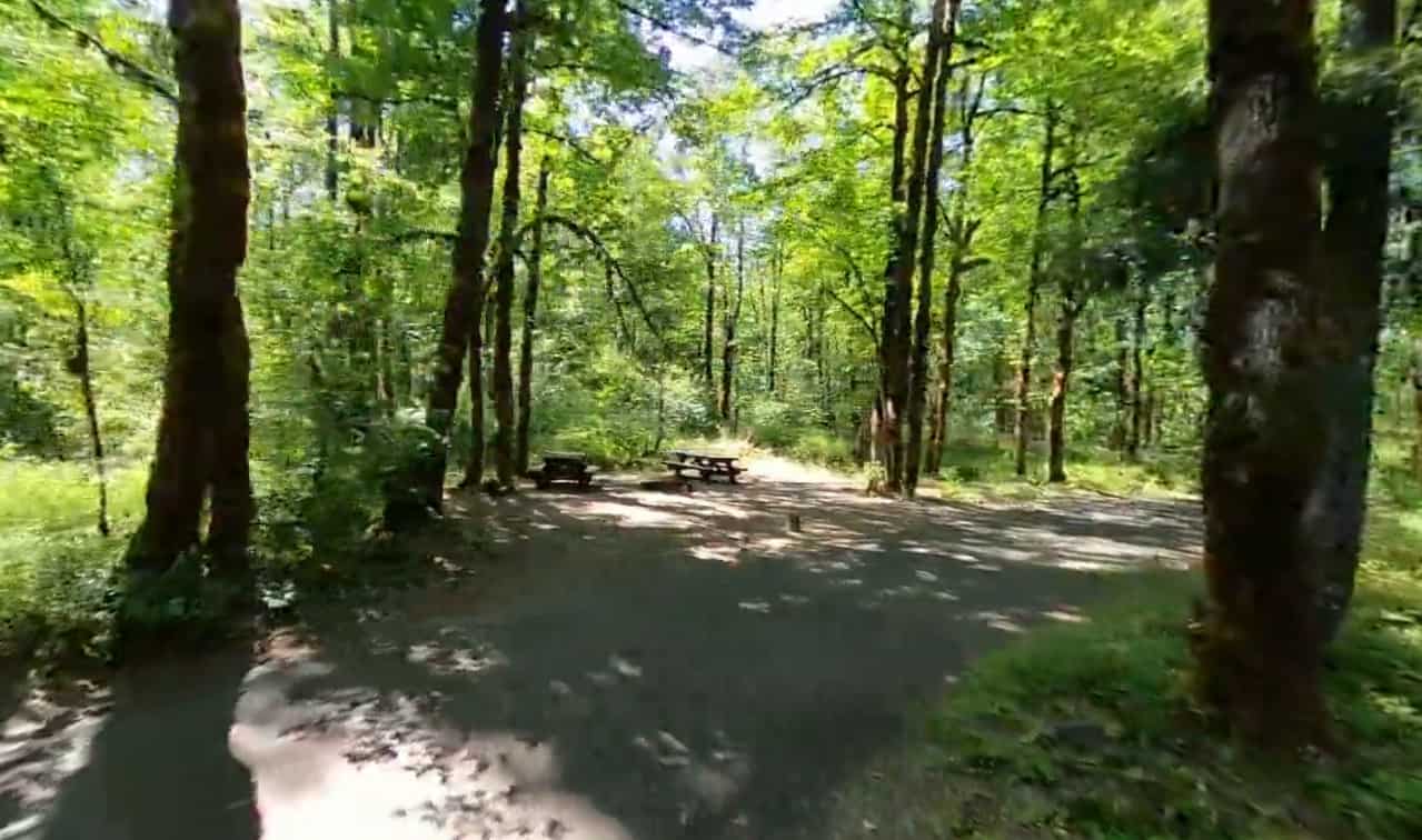 The campground is just off the East Fork Lewis River at an elevation of 1,000 feet. The campground road and trail path to the falls are paved and shaded by large evergreen trees.