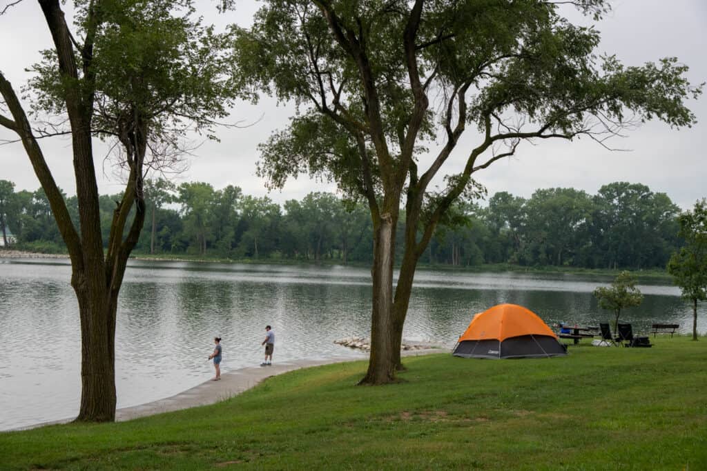 Wagon Train State Recreation Area near Hickman Nebraska offers partial and primitive (no water, electric, or sewer) hookup RV and tent camping sites adjacent to a recreational lake. Boating, fishing, picnicking and a swimming beach.